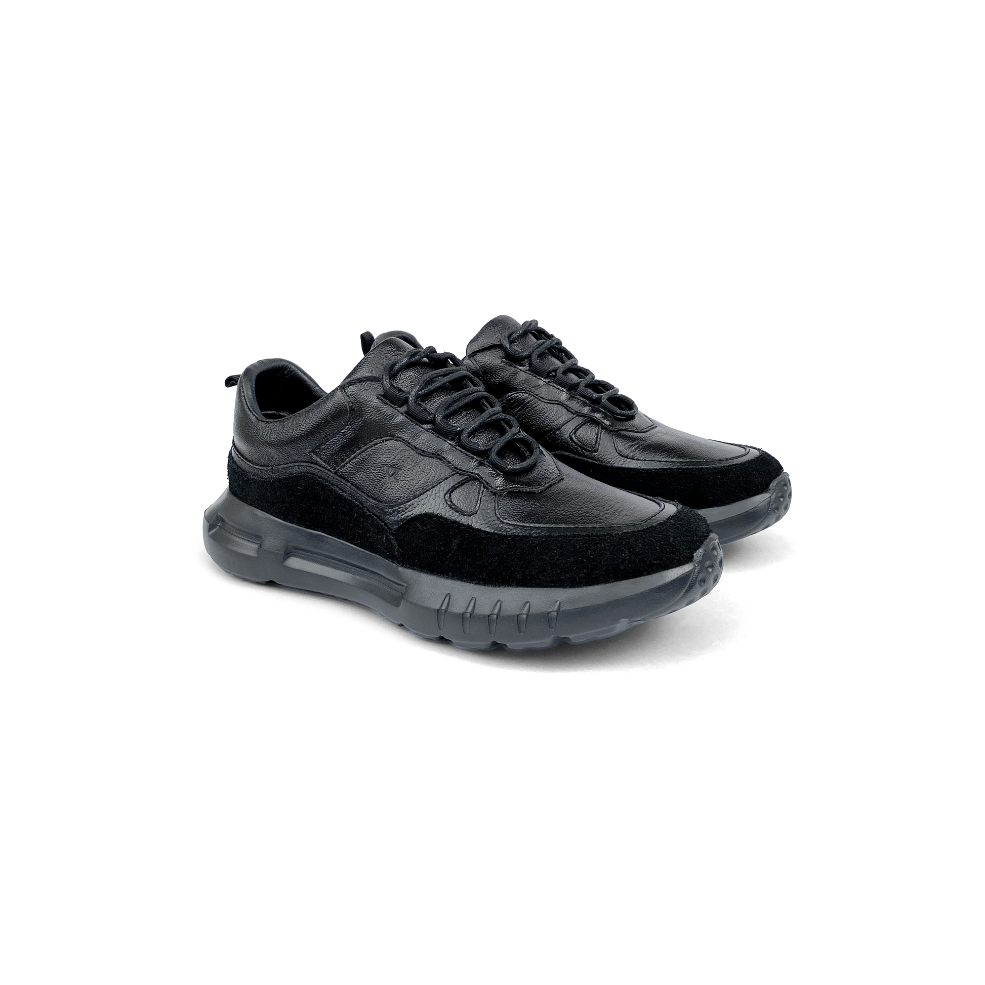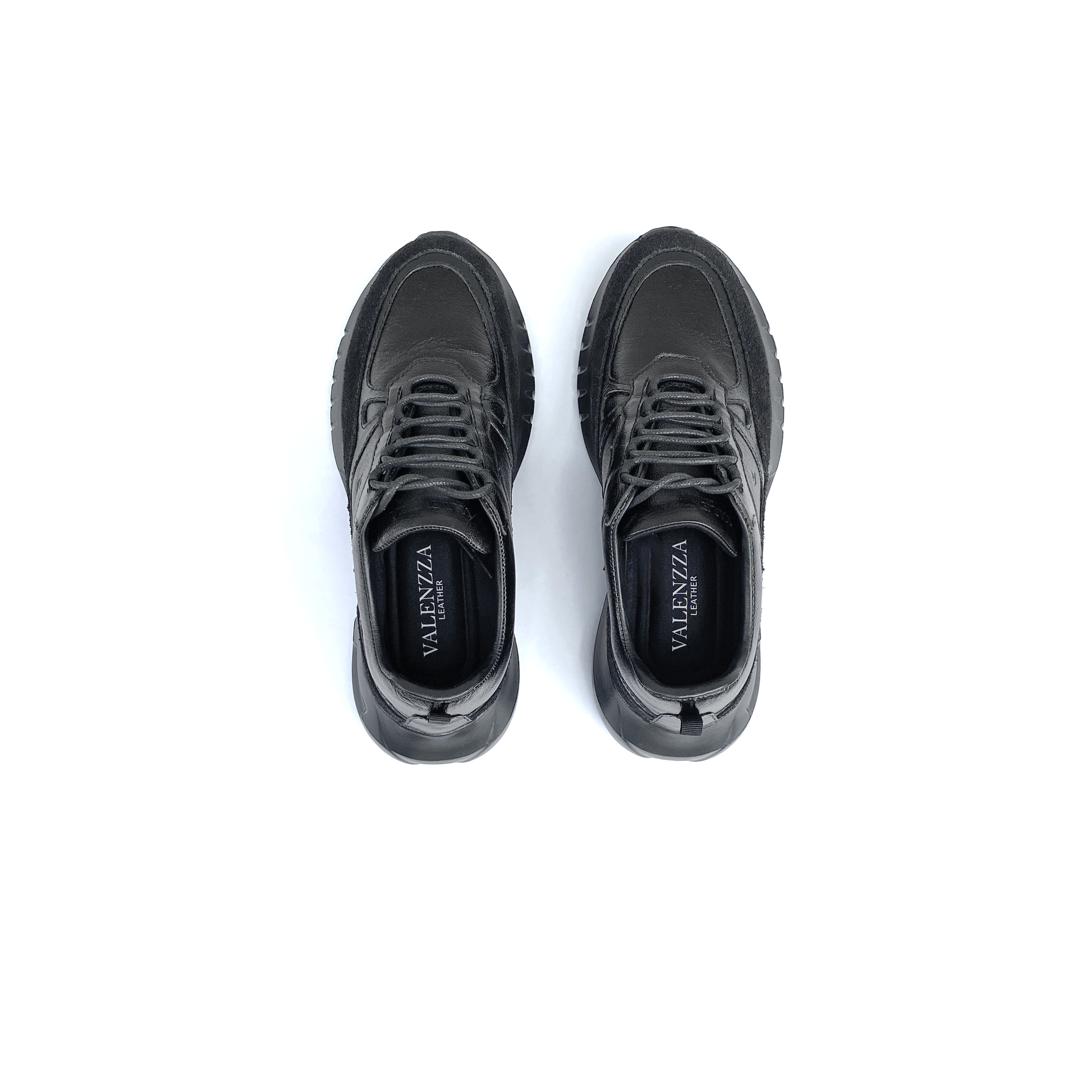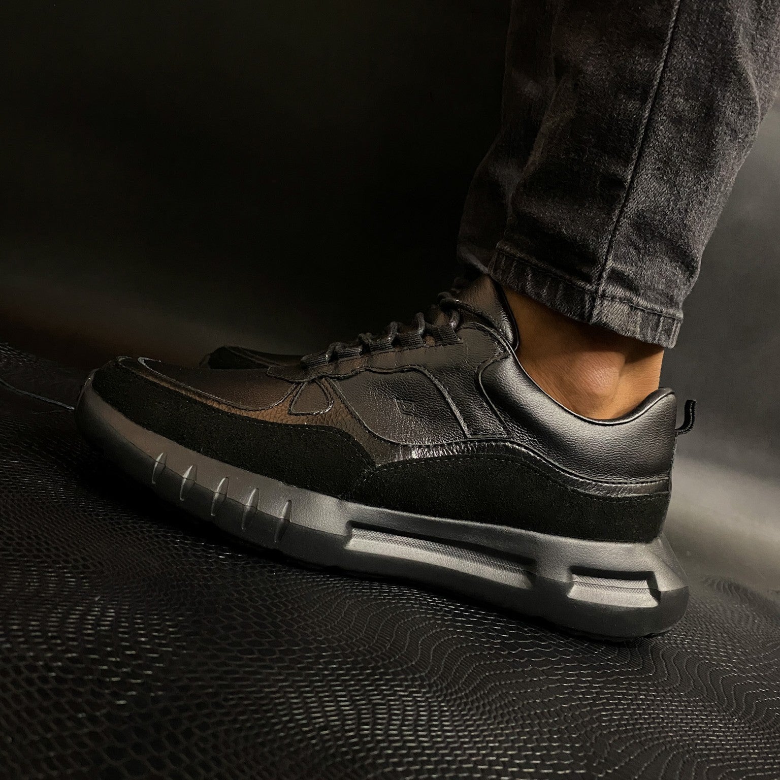 El Tyson negro es todo negro, combina cuero carnaza y cuero brillante. Es un zapato deportivo con un estilo único, ideal para un look casual y elegante